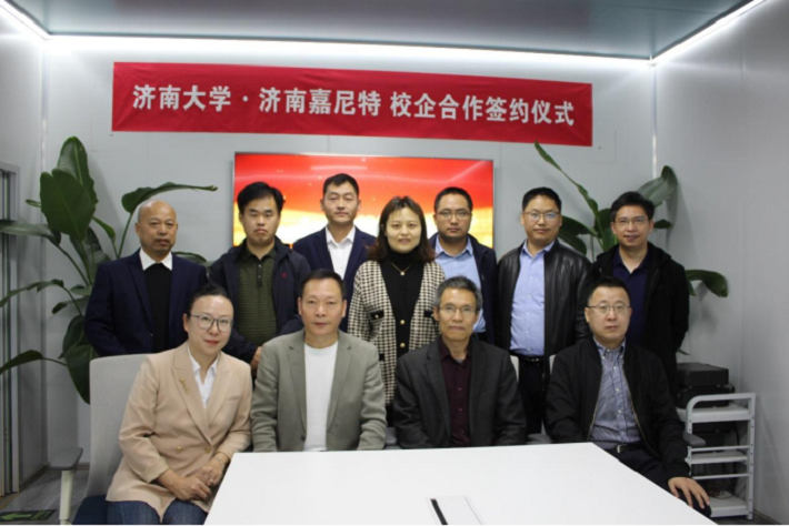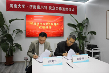 济南嘉尼特公司董事长张海生介绍了嘉尼特二十多年的发展历程和企业的面临的机遇和挑战,简要介绍了合作协议内容。双方对协议内容进行了友好协商。徐锡金、张海生代表双方签署了本科实践教学基地协议,并为基地揭牌。郑爱华、张海生代表双方签署了校企合作共建专业战略协议。
