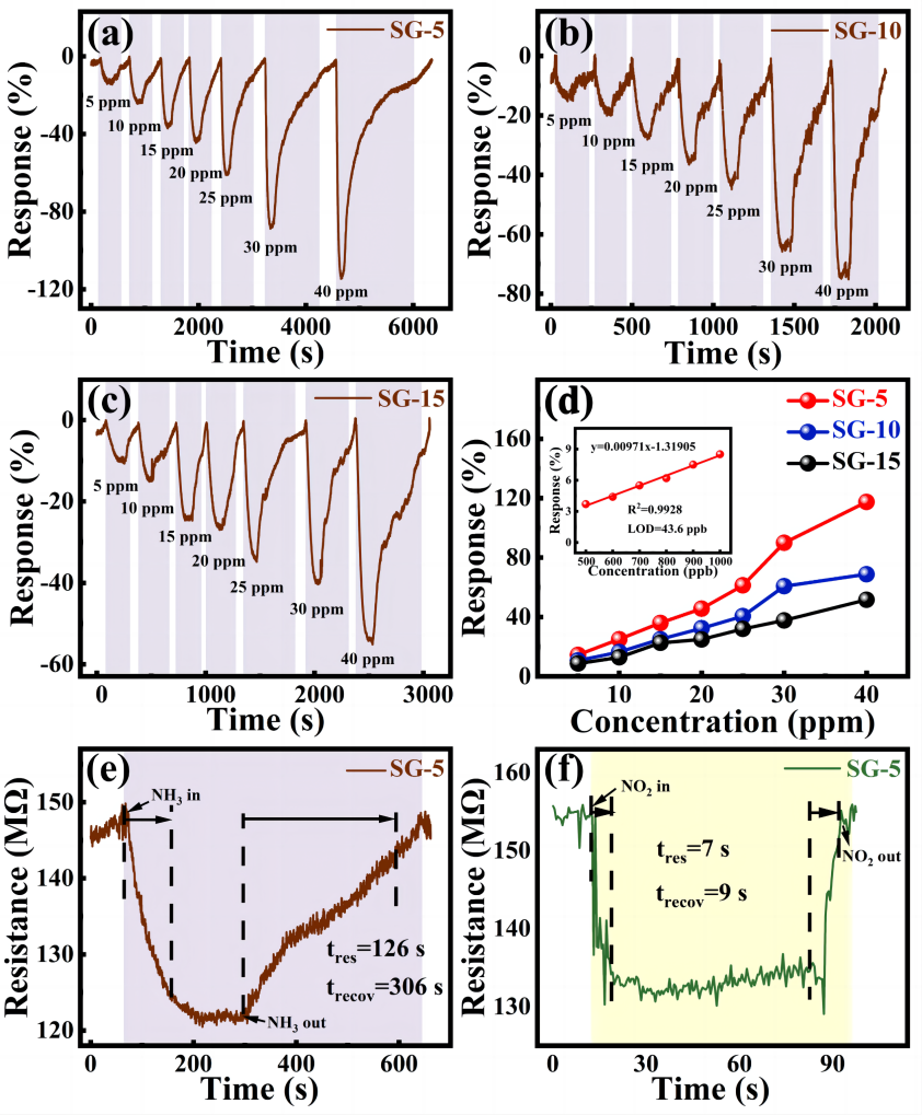 图1. SG-5 (a)、SG-10 (b)和SG-15 (c)传感器在室温下对NH3的动态传感性能。传感响应随NH3浓度的变化(d)(附图为对低浓度NH3气体的响应)。SG-5对10 ppm NH3气体(e)和10 ppm NO2气体(f)在RT下的响应-恢复过程。