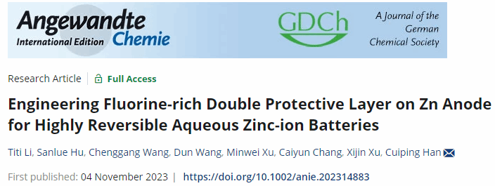 近日,徐锡金教授团队在水系储能领域取得重要研究进展,相关成果以题为《Engineering Fluorine-rich Double Protective Layer on Zn Anode for Highly Reversible Aqueous Zinc-ion Batteries》发表在顶级期刊Angewandte Chemie International Edition上。疯av