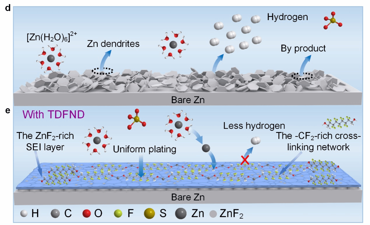 水系锌离子电池因其具有高安全性、环境友好等特点,在储能系统中具有广阔的前景。然而,锌金属负极侧存在高热力学不稳定性和不可避免的副反应,严重阻碍了水系锌离子电池大规模的实际应用。这些副反应将导致锌离子电池低的库伦效率、差的循环寿命以及锌负极低的利用率等问题。因此,在锌金属负极表面构筑一个稳定的SEI层对提高锌离子电池的性能至关重要。本文报道了一种富氟的壬烷二醇(TDFND)作为电解液的添加剂,TDFND分子因具有较大的吸附能(−1.51 eV)而优先吸附在锌负极表面形成Zn(OR)2−(R = −CH2−(CF2)7−CH2−)交联复合网络,平衡空间电场并控制Zn2+离子通量,从而实现Zn(002)晶面的均匀和致密沉积。同时,TDFND具有较低的最低未占据分子轨道能级(LUMO,0.10 eV),可以优先分解构建富含ZnF2的固态电解质界面(SEI)层。这极大的提高了锌金属负极的循环稳定性。