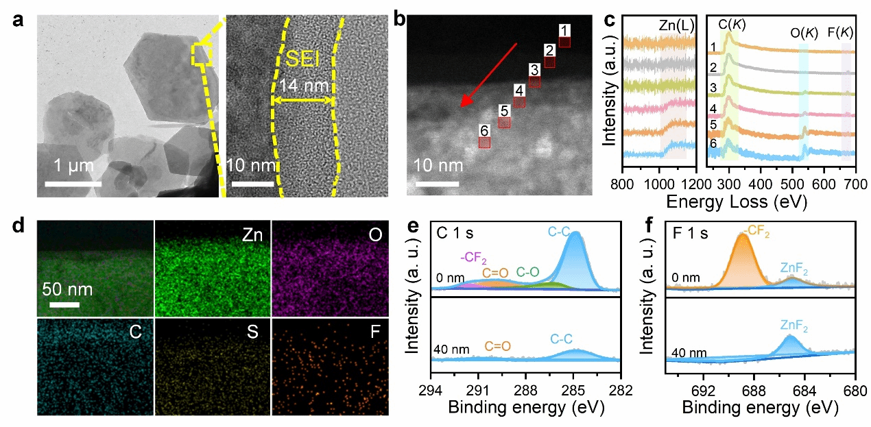 通过高分辨TEM和不同刻蚀深度的XPS表征发现,在空白电解液中引入功能性TDFND不仅可以在Zn电极表面构建富含−CF2交联网络的外层,还可以诱导形成富ZnF2的SEI内层。