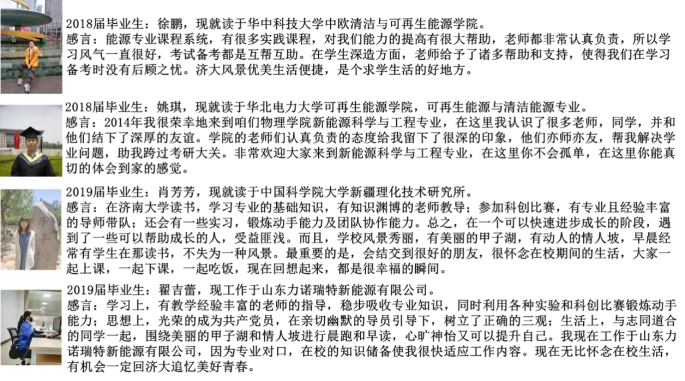 教学条件优越:新能源科学与工程专业下设太阳能与风能利用、新能源材料与器件两个方向。目前有设有光伏技术与应用、光热技术与利用、风能技术与应用、太阳能实习实训、材料特性研究、基础物理实验本科教学实验室。可以承担光伏技术、光热利用技术、材料与器件和风能发电技术等领域的理论知识、实践与设计方面的教学、研讨班和实验实训工作。新能源系先后与桑乐太阳能、皇明太阳能、力诺瑞特、大唐平阴风电场等建立了学生实习实训基地,为增强学生的工程实践能力奠定了基础。以山东省高等学校重点实验室为依托,学生可以开展更为专业的创新创业训练。
